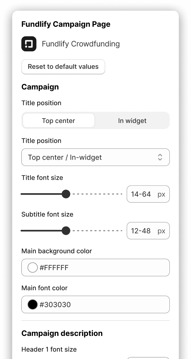 Add the Fundlify Campaign section to any Online Store 2.0 theme. Tweak type, colors, spacing, buttons and the progress bar with live preview. No code. No theme conflicts. Fully responsive.